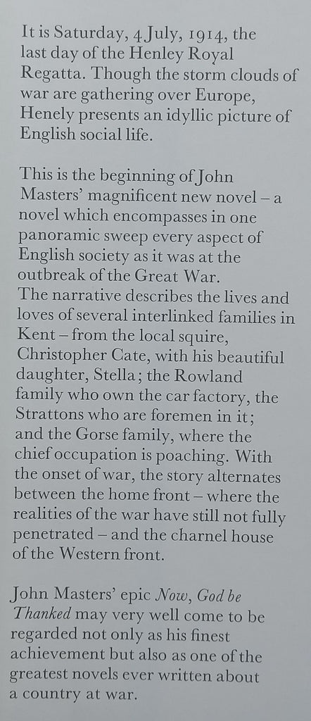 Now, God be Thanked | John Masters Publisher: Michael Joseph (1979) ISBN-13: 0718118006 Condition: Very good. Slight rubbing to DJ. Binding: Hardcover with DJ Pages: 589 Dimensions: 22,2 x 14,8 x 3,7cm SKU: IZb1046 Weight: 0,85kg Price: R57,00